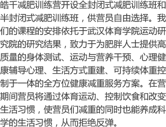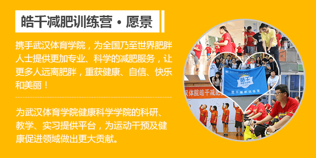 武汉皓千减肥训练营的前身是于2008年创办的武汉体院运动减肥中心。 依托武汉体院“体质健康研究中心”强有力的专业技术支撑,在10年的发展历程中,为数千名受肥胖困扰的青少年成功减重。